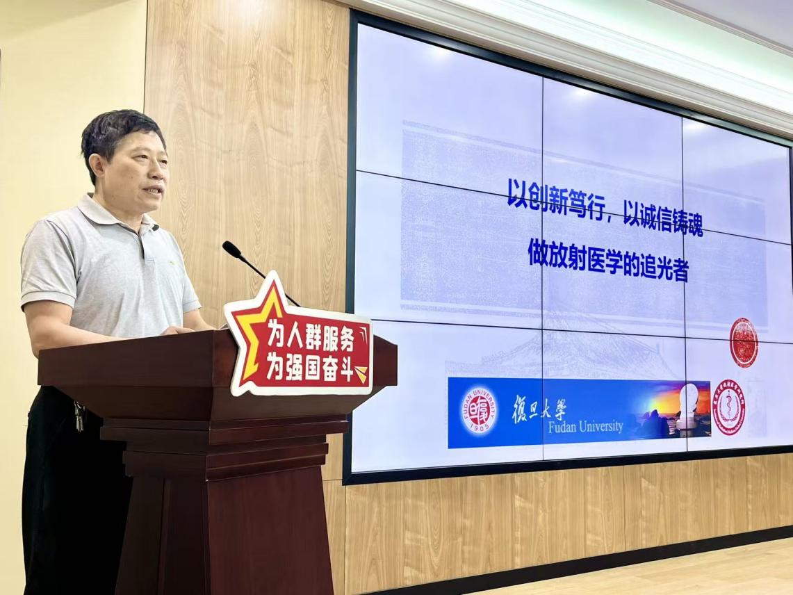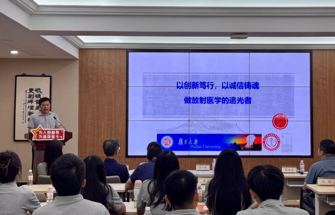 蒋蕾书记代表放医所全体师生热烈欢迎2025级新生加入复旦上医大家庭,并引用复旦上医“为人群服务、为强国奋斗”的精神寄语新生,在未来三至五年的科研征程中以“严谨、求实、创新、奉献”的科学家精神为座右铭,把个人理想写进健康中国战略,把科研论文书写在祖国大地上。鼓励大家勇攀高峰,提早布局学术与人生,以青春与学识在“教育强国”、“健康中国”双赛道并肩奔跑,成长为“卓越而有趣”的新时代复旦医学人。