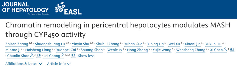 近日,国际肝病学领域顶级期刊《肝脏病学杂志》(Journal of Hepatology)在线发表了复旦大学放射医学研究所畅磊研究员、邵春林研究员与南方科技大学陈曦教授团队的合作研究成果,题为“Chromatin remodeling in pericentral hepatocytes modulates MASH through CYP450 activity”。该研究系统揭示了位于肝小叶中央静脉周围的Lgr5⁺肝细胞中,染色质重塑因子DPF2通过调控 CYP450代谢酶活性与全反式维甲酸(atRA)平衡,进而影响放射性肝损伤、代谢相关脂肪性肝炎(MASLD)发生发展的全新机制,为 放射性肝损伤、MASLD/MASH的发病机理研究与临床干预提供了重要理论依据。